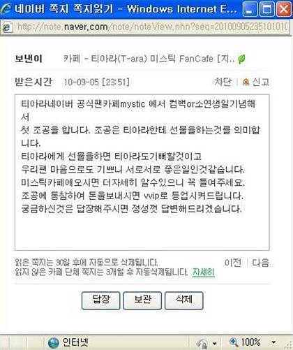 티아라 팬 카페 미스틱의 조공 관련 쪽지 |