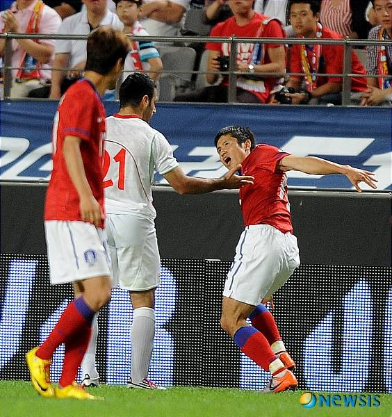【서울=뉴시스】허상욱 기자 = 7일 오후 서울월드컵경기장에서 열린 대한민국과 이란의 평가전에서 이영표(대한민국)가 레자에이(이란)와 볼을 다투며 몸싸움을 하고 있다.