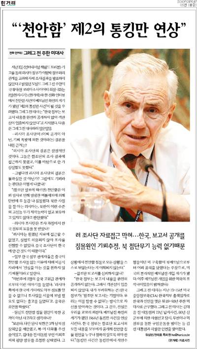 그레그 전 대사는 한겨레 4일자 5면 인터뷰에서 천안함 사건과 관련해 제2의 통킹만 사건이 연상된다고 주장했다. 통킹만 사건은 미군 구축함이 북베트남의 어뢰 공격을 당했다는 주장으로 미국의 본격적인 베트남전 참전의 계기가 됐다. 그러나 베트남전 개입을 위한 미국의 조작극임이 밝혀졌다.