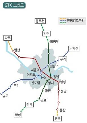 향후 경기도의 제안대로 GTX가 건설될 경우 ▲킨텍스~동탄(74.8㎞) ▲송도~청량리(49.9㎞) ▲의정부~금정(49.3㎞) 등 세 개 신설 철도 노선이 지하에 생긴다.