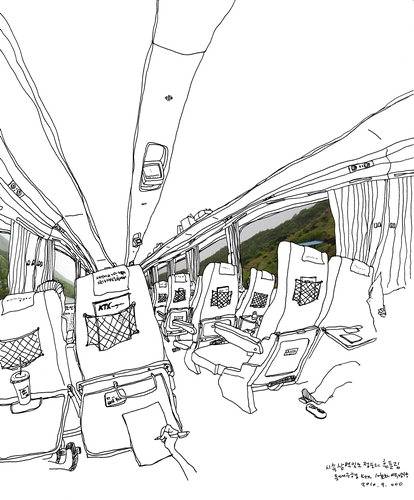 하지만 얼마 전 경부선을 탔을 땐 슬프게도 역방향 통로자리에 앉게 되었습니다. 창에는 커튼이 쳐졌고 주변에 아름다운 사람도 없었기에 나는 딱히 할 일이 없었습니다. 그래서 그냥 기차의 덜컹거림에 몸을 맡긴 채 그림을 그렸습니다.