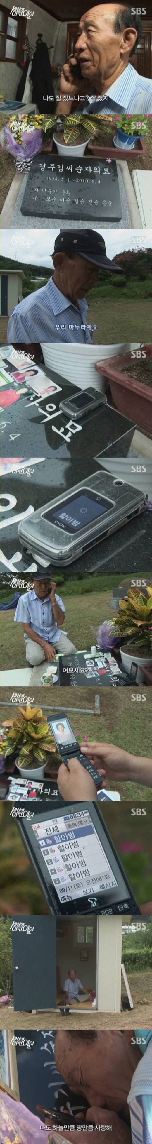 또 무덤근처에 컨테이너까지 만들어 하루의 절반을 이곳에서 보내는 박 할아버지는 수시로 할머니에게 전화를 걸어 눈길을 끌었다. 통화하는 모습이 마치 두 사람이 대화를 하는 것처럼 자연스러웠던 것. 잠깐 어딜 가도 자신에게 전화를 했던 아내를 떠올리며 박 할아버지는 하루에도 수십 번씩 할머니에게 전화해 소소한 일상을 나눈다고 밝혔다.