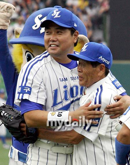[마이데일리 = 대구 유진형 기자] 삼성의 레전드 '양신' 양준혁(41)이 19일 오후 대구 시민야구장에서 열린 2010 프로야구 삼성 라이온즈와 SK 와이번스의 양준혁 은퇴경기에서 아버지와 그라운드로 올라와 포옹하고 있다.