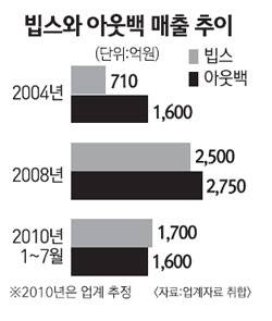 빕스는 지난해 같은 기간에 비해 18% 성장을 한 반면 아웃백은 3% 늘어나는 데 그쳤다.