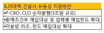 강해성 대한건설협회 팀장은 "8.29대책의 건설사 유동성 지원방안이 아직 작동을 하지 않고 있어 업계에 미치는 영향이 없다"면서 "P-CBO 발행의 경우 회사채를 발행하지 못하는 중견기업들의 자금난 해소에 도움을 줄 수 있을 것으로 기대된다"고 말했다.