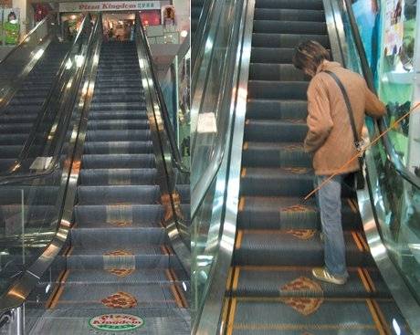 또한 피자킹덤(Pizza Kingdom) 에스컬레이터 광고는 매장에 올라오는 에스컬레이터 입구에 맛있는 피자 조각 수천 쌍의 이미지를 부착해 피자 왕국이란 체인 브랜드 이미지를 실감하게 만드는 것은 물론 계단이 움직일 때 여분의 치즈가 늘어나는 느낌을 살려 사실감과 고객들로 하여금 또 다른 재미를 느낄 수 있도록 했다. 바닥에 떨어뜨려 놓은 피자조각의 이미지가 더럽다고 느껴질 법도 하건만 놀랍게도 한달만에 53%의 매출 증가를 이뤘다.