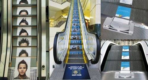 에스컬레이터를 이용한 게릴라 마케팅 광고로 크리에이티브가 돋보이는 사례도 있다. 계단마다 각기 다른 헤어스타일을 부착해 그 조각들이 아래 계단의 사람얼굴에 매칭되도록 만들어 색다른 흥미를 유발시켰던 주스살롱(Juice Salon) 광고와 에스컬레이터 계단에 놀이동산 롤러코스터를 타며 즐거워하는 관람객의 이미지를 프린팅해 생동감있는 광고를 구현한 브라질 호피 하리(Hopi Hari) 놀이공원의 광고 등이 그것이다. 그리고 프린터 출력물이 인쇄되어 나오는 착각을 불러 오게 만들었던 HP의 프린터 에스컬레이터 광고도 크리에이티브가 돋보인 게릴라 마케팅 광고다.