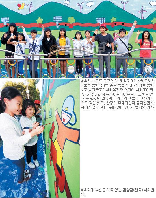 "우리가 어떻게 벽화를 그리겠느냐"며 일주일에 한 번 있는 모임 시간에도 장난질을 치던 아이들은 지난해 11월 복지관 지하주차장에 벽화를 완성하곤 싹 달라졌다. 첫 모임 때부터 참가했다는 노유나(11·서울 방학초 4)양은 "처음에 벽화를 다 그린 다음 너무 신났고, 뭐든지 할 수 있을 것 같은 생각이 들었다"고 자랑했다. 노양은 복지관 3층 점프교실(올해 5월)과 안방학동 1126번 버스 종점(7월)에도 벽화를 그렸고, 동네 노인정에는 타일에 그림을 그려 붙이는 타일벽화(6월)를 그렸다며 손가락을 하나하나 꼽았다.