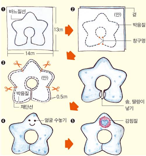 창구멍 시접을 안으로 잘 밀어넣고 공그르기로 막은 다음 수실이나 색실로 눈과 입을 수놓아요. 눈은 작은 매듭이나 홈질 한두 땀으로 표현하고 입은 박음질해요.