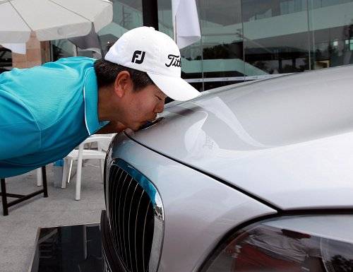 ◇유종구가 홀인원 상품으로 걸린 BMW 자동차에 키스하고 있다.KGT 제공 |