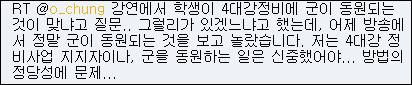 정 의원은 11일 트위터에 "강연에서 학생이 4대강 정비에 군이 동원되는 것이 맞냐고 질문. 그럴 리가 있겠느냐고 했는데, 어제 방송에서 정말 군이 동원되는 것을 보고 놀랐습니다. 저는 4대강 정비사업 지지자이나, 군을 동원하는 일은 신중했어야…방법의 정당성에 문제…"라고 올렸다.