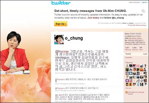 최근 트위터 활동을 열심히 하고 있는 정옥임 한나라당 의원이 4대강 사업에 군이 투입됐다는 걸 뒤늦게 알고 이에 관련된 트위터를 올렸다가 "원내대변인이 그걸 몰랐느냐"는 핀잔을 들었다.