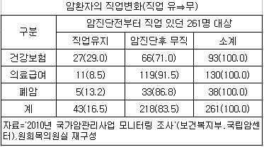 조사에 따르면 대상자 600명 중 암 진단 전부터 직업을 갖고 있던 사람은 261명이었다. 이들이 암 '진단 후' 직업을 유지하는 경우는 16.5%(43명)에 불과했다.