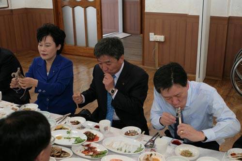 국회 보건복지위 소속 민주당 주승용 의원과 한나라당 손숙미 의원이 산 낙지를 맛있게 먹고 있다.