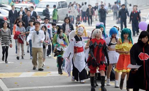 17일 오전 경기도청 운동장에서 김문수 경기도지사가 참석한 가운데 2010 세계인과 함께하는 Hand In Hand 다문화 한마당 페스티발이 열렸다. 참가자들이 각국의 전통의상과 국기를 들고 다문화 한가족 걷기대회를 하고 있다.이상섭 기자. babtong@heraldm.com