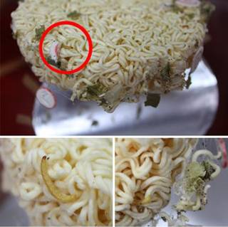이 제품에는 애벌레 몇 마리가 건조된 면발 사이를 기어다니는 게 포착됐다. 또 라면 아랫 부분엔 알과 번데기로 보이는 검은 물질도 발견됐다. 문제의 제품은 유통기한이 두 달 넘게 남아 있었다.