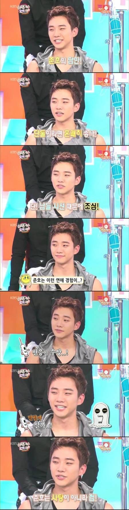 25일 방송된 KBS 2TV 예능 프로그램 '해피버스데이'에 출연한 준호는 '여자친구가 자기가 먹던 사탕을 먹으라고 준다면 어떻게 하겠냐?"라는 사전 질문지에 "받아 먹어보도록 노력한다"고 답했다.