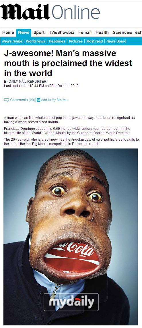 영국 매체 '데일리 메일'은 28일(현지시각) "프란시스코 도밍고 호아킴(20·앙골라)이 최근 이탈리아의 한 방송에 출연해 입안에 콜라 캔을 가로로 넣는 묘기를 선보였다"며 "그는 1분에 무려 14번이나 콜라 캔을 넣었다 뺐다"고 전했다.