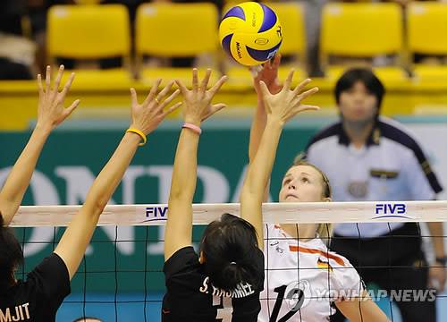 epa02427406 Heike Beier (R) of Germany spikes the ball against Thailand in the first round match at the Women's Volleyball World Championships in Matsumoto city, Nagano province, Japan, 03 November 2010. Germany won in three sets. EPA/EVERETT KENNEDY BROWN < 뉴스의 새 시대, 연합뉴스 Live >< 모바일 애플리케이션 >< 포토 매거진 >< 저작권자(c)연합뉴스. 무단전재-재배포금지. >
