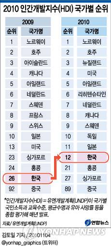 (서울=연합뉴스) 김토일 기자 = 유엔개발계획(UNDP)이 국가별 국민소득과 교육수준, 평균수명, 유아 사망률 등을 종합 평가해 매년 내놓는 인간개발지수(HDI) 순위에서 한국이 올해 세계 12위를 차지했다.