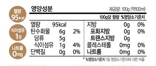 '백세주' 열량은 100g당 총 95㎉이며 지방, 콜레스테롤, 나트륨은 함유되지 않았다. 12가지 국산 한약재(구기자, 오미자, 인삼, 하수오, 오가피, 구기엽, 황기, 건강, 산수유, 맥문동, 산사자, 산약)와 양조전용 쌀인 국내산 '설갱미'로 만들어지는 '백세주'는 전통주 시장의 대표주자다.