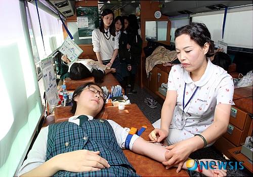 【수원=뉴시스】강종민 기자 = 10일 경기 수원 영복여고 학생들이 사랑나눔 실천을 위해 단체헌혈을 하고 있다.