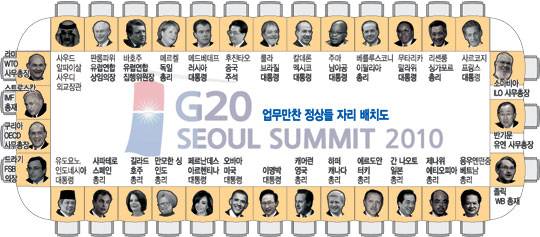 이명박 대통령은 11일 저녁 국립중앙박물관에서 열린 서울 주요 20개국(G20) 정상회의 첫 일정인 업무만찬에서 좌우에 각각 버락 오바마 미국 대통령과 데이비드 캐머런 영국 총리를 앉혔다. 오바마 대통령은 1·3차 G20 정상회의 의장국, 캐머런 총리는 2차 의장국 자격으로 앉았다. 오바마 대통령 왼쪽은 3인의 여성 정상 중 하나인 크리스티나 페르난데스 아르헨티나 대통령이 차지했다. 캐머런 총리 우측에는 스티븐 하퍼 캐나다 총리가 자리했다. 후진타오 중국 국가주석은 이 대통령과 마주보며 식사를 한다.