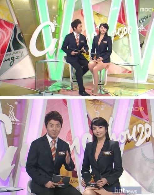 양 아나운서는 14일 새벽 방송된 2010 광저우 아시아경기대회 하이라이트에서 피부색과 비슷한 색상의 짧은 원피스를 입고 등장했다.