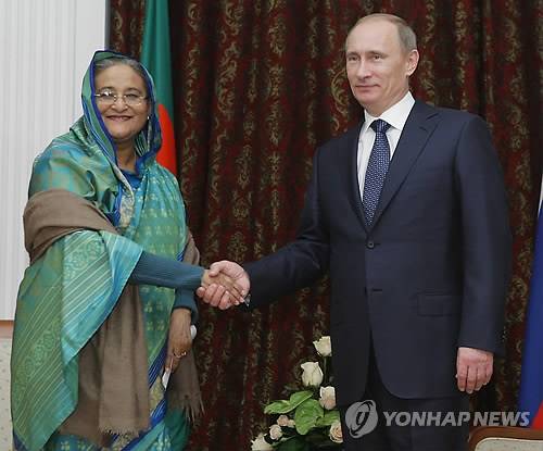 (AP=연합뉴스) 블라디미르 푸틴 러시아 총리(오른쪽)와 셰이크 하시나 방글라데시 총리가 23일(현지시각) 러시아 상트페테르부르크에서 만나 악수하고 있다.