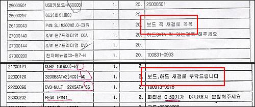 노조가 공개한 지난 8~10월 치 생산작업지시서에 따르면, 정부 조달용 컴퓨터에는 '(메인)보드, 하드 새 걸로 부탁드립니다', '보드 꼭 새 걸로 꼭꼭' 등의 메모가 쓰여 있다. 곽은주 지회장은 "광범위하게 중고 부품이 사용되니까 이런 메모가 들어간 것 아니냐"고 지적했다.