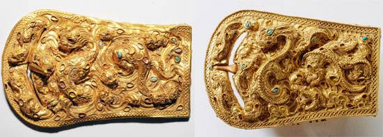1부 '실크로드의 도시들'에서는 서역북로의 카슈가르, 쿠차, 투루판과 서역남로의 호탄, 누란 그리고 천산북로의 오아시스가 소개된다. 큰 용 한 마리와 작은 용 일곱 마리가 구름 위에서 노는 듯한 모습을 표현한 황금대구(허리띠 잠금장치) 등의 유물을 볼 수 있다.