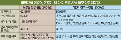 이명박(MB) 정부에 국방 철학이 안 보인다는 비판은 절반만 맞다. 적어도 하나의 확고한 방향성은 읽히기 때문이다. ‘돈 드는 일은 내 임기 중에는 안 한다.’ MB표 국방 정책의 핵심은 이 한 줄로 요약된다(〈시사IN〉 제160호 기사 참조). 2005년 노무현 정부가 입안한 ‘국방 개혁 2020’을 MB 정부 들어 어떻게 수정했는지 자세히 들여다보면, 위 원칙이 일관되게 관철되고 있음을 확인할 수 있다. 그동안 정부와 군이 구체적 내용을 공개하지 않았던 ‘국방 개혁 2020’ 원안(2005년)과 MB 정부의 1차 수정안(2009년)을 일부 입수해 비교해봤다. 국방 개혁 2020 원안은 2020년까지 순수 국방 개혁 비용으로 67조원, 전체 국방비 기준으로 621조원을 투입하는 계획이었다. 군의 문민 기반 확대, 병력 감축과 전시작전권 회수에 대비한 전력 구축, 육군·해군·공군의 균형과 합동성 강화 등을 그 핵심으로 한다.