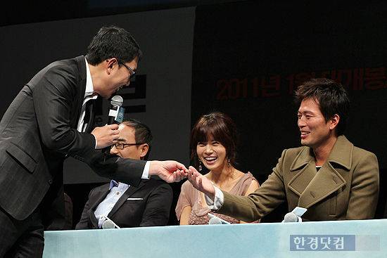 16일 오전 서울 압구정 CGV에서 열린 영화 '글러브'(감독 강우석, 제작 시네마서비스) 제작발표회에 참석한 사회자 김제동이 정재영의 손을 만지고 있다.