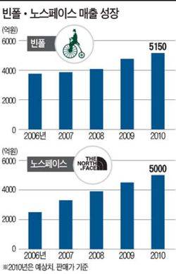 빈폴과 노스페이스가 이 같은 성과를 올린 것은 끊임없는 제품 라인 확장과 '플래그십 스토어'(브랜드 인지도를 높이는 데 초점을 맞춘 초대형 매장) 설치 등 한발 앞선 마케팅 전략 덕분이라는 분석이다.