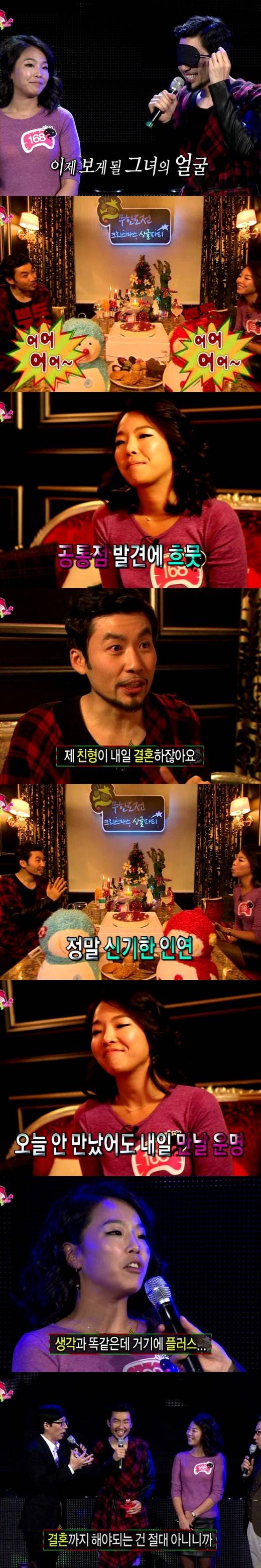 이어 두 사람의 독특한 인연도 공개됐다. 알고 보니 지니씨가 노홍철의 형과 이미 친분이 있는 사이라는 것. 지니씨는 "(노홍철의 형이) 친한 친구의 대학선배로 3,4년 전부터 알고 지내고 있고 만난 적도 있다"며 며칠 후에 치러질 노홍철 형의 결혼식에도 초대받은 사실을 공개했다. 노홍철은 "오늘 만나지 않았어도 결혼식장에서 만날 운명이었다"며 놀라워했다.