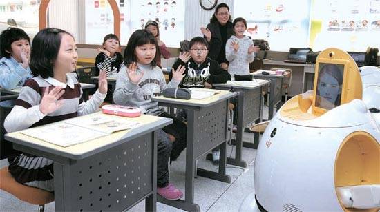 27일 대구시 학정초등학교에서 영어교사 보조 로봇인 '잉키'가 어린이들에게 영어 발음을 가르치고 있다. [대구=프리랜서 공정식]