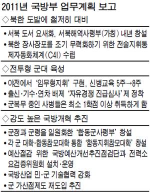 국방부는 2011년 한 해 동안 북한의 도발 위협에 대해 감시ㆍ타격 전력을 대폭 늘리고 각급 부대의 전투력을 향상시키기 위해 훈련과 인사 제도를 개선하는 데 총력을 기울이기로 했다. 특히 백령도와 연평도 등 서북 도서를 조기에 요새화하고 내년에 서북해역사령부(가칭)와 합동군사령부를 창설하거나 시행방안을 확정하는 등 군 구조를 대폭 개편할 계획이다.