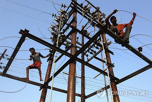 (AP=연합뉴스) 30일 인도 알라하바드의 갠지스강 둑 옆으로 서 있는 고압선을 고치는 배선공의 모습이 보인다. 재생가능 에너지청에 의하면 인도는 2022년까지 재생가능 에너지의 발전량을 4배까지 늘릴 계획이다.