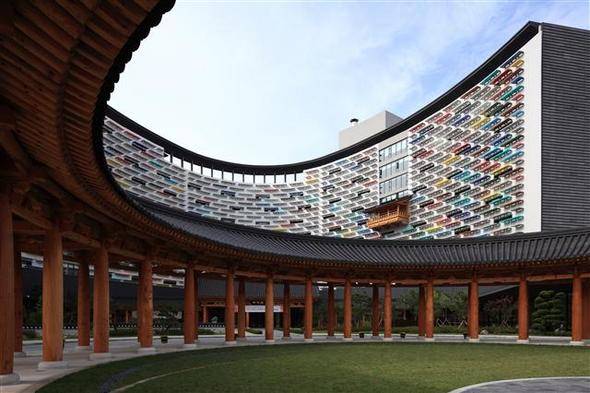 함께 건물을 답사한 국내 건축가들 모두 이구동성이었다. 부여시 백제재현단지에 들어선 롯데부여리조트 '백상원' 건물은 분명 달랐다. 흔히 보아왔던 콘도 건물과도 달랐고, 항상 금빛 치장만으로 꾸미기 일쑤이던 롯데그룹 건물 특유의 통속적인 상업 건물과도 달랐다. 거대한 말발굽처럼 크게 휘어돌아가는 두 건물이 짝을 이루고, 거물 외벽에는 파스텔톤 컬러판이 가득 붙었다. 건물 앞에는 동그란 한옥 회랑이, 건물 중간에는 난데없이 한옥이 한 채 콕 박혀 있었다. 건물 모양도, 장식도, 공간처리도 어딘가 다르면서도 콘도 건축 특유의 재미가 잘 살아났다.