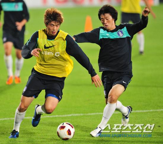 A대표팀이 '약속의 땅' 도하에서 첫 훈련을 가졌다. 51년만에 아시안컵 정상 탈환을 목표로 하는 A대표팀이 8일 오전(한국시간) 카타르 도하에 위치한 알 와크라 연습구장에서 훈련을 시작으로 본격적인 우승 사냥에 나섰다. 기성용(왼쪽)과 김보경이 몸싸움을 벌이고 있다. 도하(카타르)=김경민 기자 kyungmin@sportschosun.com