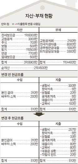 ◆국민연금, 계속 유지해야=김씨네의 불입 보험료 비중은 가계 수입 대비 4%로 일반 가정의 평균치보다 낮다. 보장 내용도 만족스럽지 않다. 실손보험에 남편 7만5000원, 부인 5만5000원을 새로 가입하길 바란다. 김씨는 교사로 노후를 다른 가정보다 안정적으로 지낼 수 있다. 하지만 남편이 가입한 국민연금은 중단하지 말고 60세까지 지속적으로 불입하길 권한다. 지금까지 부은 금액으론 연금 수령조건이 되지 않아서다. 60세까지 국민연금을 유지할 경우 65세 이후엔 매월 60만~70만원 정도를 받을 수 있을 것이다. 국민연금은 물가에 연동해 연금을 지급하는 상품으로 수익률이 높은 축에 속한다. 현금흐름이 개선된 후엔 좀 더 많은 금액을 가입해 연금 혜택을 듬뿍 누리도록 하자.