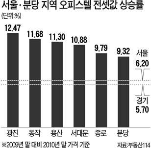 부동산114에 따르면 지난달 말 기준 서울지역 오피스텔 전셋값은 1년 전보다 평균 6.2% 올랐다. 광진구가 12.47%로 상승률이 가장 높았다. 동작(11.68%) 용산(11.3%) 서대문(10.88%)도 상승률이 높았다. 분당 오피스텔 전셋값도 같은 기간 평균 9%가량 뛰었다.