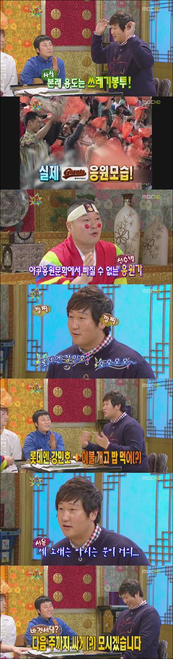 한편 이날 이대호는 부산 사직 구장의 명물 비닐 봉투에 대해 "본래 용도는 쓰레기 봉투다. 어느 순간 한 명이 쓰고 두 명이 쓰니깐 응원도구가 됐다. 이제 안 주면 난리가 난다"고 밝혔다.