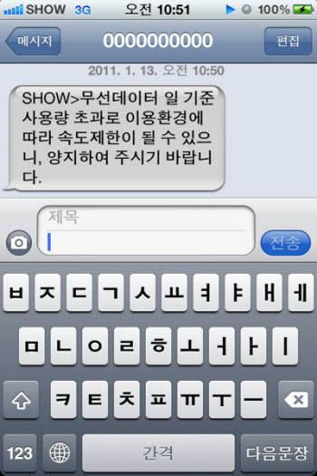 24일 관련 업계와 스마트폰 이용자들에 따르면 지난달 초부터 KT와 LG유플러스가 자사 스마트폰 가입자 중 하루 3G 데이터 사용 한도를 넘어선 고객에게 '데이터 속도 제한'을 할 수 있다는 일명 '서비스 품질(QoS·Quality of Service)' 문자를 발송하기 시작했다.