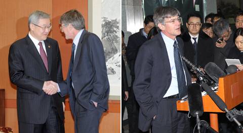 26일 오전 11시 서울외교부청사 17층 접견실. 한국을 방문한 제임스 스타인버그 국무부 부장관이 들어오자 카메라 플래시가 터졌다. 김성환외교부 장관이 웃는 얼굴로 오른손을 내밀었다. 스타인버그 부장관은 양복 상의 단추를 푼 상태에서 왼손을 바지 호주머니에 넣은 채 악수를 했다.