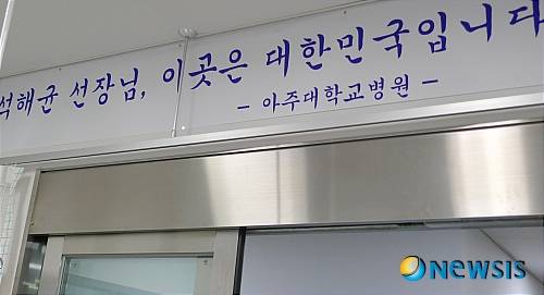【수원=뉴시스】이승호 기자 = 석해균 선장(58)이 치료받고 있는 경기 수원 아주대병원 중환자실에 '이곳은 대한민국 입니다'라고 적힌 현수막이 붙어있다.(사진 = 아주대병원 제공)