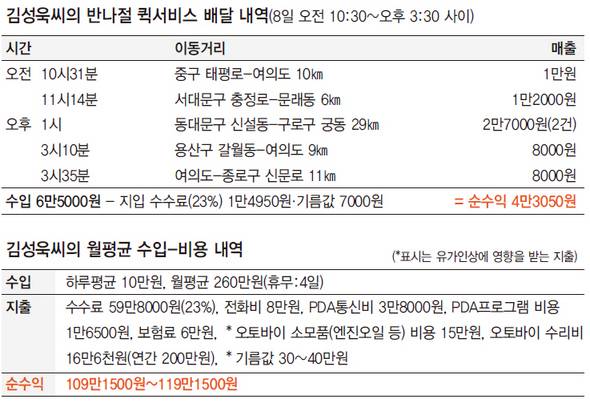 특수고용직이어서 회사로부터 기름값을 한푼도 지원받지 않는 퀵서비스 기사들은 요즘 하루가 다르게 치솟는 기름값에 애가 타들어간다. 수수료와 통신비, 보험료, 오토바이 수리비 등을 스스로 책임지는 탓에 매출액의 50%가량만 가져가는 상황에서, 최근에는 기름값이 올라 수익이 절반 이하로 떨어졌다. 김씨가 일주일에 한번 쉬고 한 달을 일해 버는 돈은 260만원가량이지만, 기름값 때문에 남는 돈은 110만원 남짓이다. 김씨 같은 처지의 퀵서비스 기사는 2008년 기준으로 13만명(노동사회연구소 조사)에 이른다.