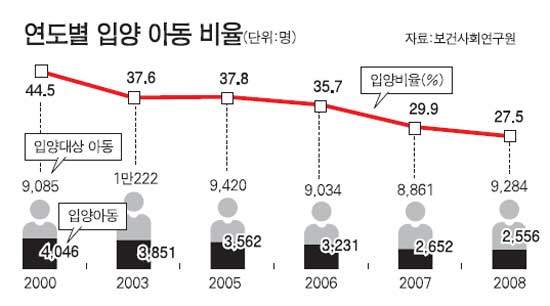 13일 한국보건사회연구원이 공개한 '국내 입양실태와 정책방안 연구' 보고서에 따르면 2008년 입양대상 아동은 9,284명이었고 이중 2,556명만 입양됐다. 입양비율은 27.5%. 2007년 29.9%로 입양비율이 떨어진 이후 계속 감소하고 있다. 2000년 44.5%였던 입양비율은 8년 사이 20%포인트 가까이 떨어졌다.