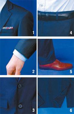 1 자신의 어깨선과 정장 어깨선을 딱 맞출 것. 2 소매 길이는 셔츠가 1~1.5㎝ 나오면 정석이다. 3 단추가 두 개 달린 디자인이 기본 중의 기본. 4 허리 주름은 아예 없어야 아저씨 정장 같지 않다. 5 바지는 밑단이 늘어지지 않게 맞출 것. 6 뒤트임은 가운데보다 양쪽 옆으로 두개 있는 것이 날씬해보인다.