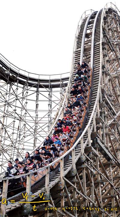 차량이 1,000m 가까운 길이의 레일을 시속 약 100km로 2~3분 만에 오르락내리락하는 동안 탑승객들은 속도감을 즐긴다. 물리학적으로 엄밀히 말하면 사람들이 느끼는 건 속도 자체가 아니라 속도의 변화(가속도)다. 탑승객이 롤러코스터 차량에 앉으면 의자를 내리누르는 힘이 생긴다. 이에 반해 의자가 탑승객을 받치는 힘도 생긴다.